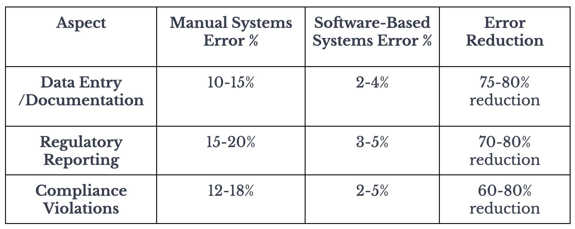 Conversely, software-based compliance systems have error rates of 2-5% with studies like Forrester’s 2024 analysis, showing a 75% reduction in documentation errors.